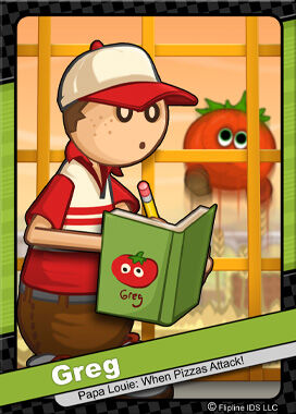 格雷格是一個喜歡玩的孩子,住在老爹比薩店樓上的公寓裡。和其他顧客一樣,格雷格被洋蔥怪[2]囚禁在鍍金的籠子裡好長時間。在此期間,他觀察到該地區有幾十個野生的跳躍番茄怪[3]。格雷格研究了他們,並做了詳細的筆記和素描。在他被老爹路易救了出來之後,格雷格成了一個熟知西紅柿的專家。